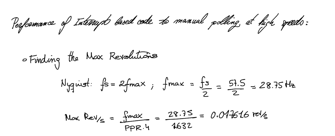 In the polling method, the MCU repeatedly checks the state of the input pin in a continuous loop to see if it has changed. This approach is simple to implement, but it can become inefficient because the MCU spends much of its time checking the pin instead of performing other tasks. More importantly, if the encoder signal changes faster than the MCU can check it, pulses may be missed, resulting in inaccurate measurements. In contrast, interrupts allow the MCU to automatically react whenever the pin changes state. When an interrupt is triggered, the MCU immediately pauses its current operations and jumps to a special function designed to handle that event. This ensures that no pulses are missed, even at high speeds, while also freeing the MCU to perform other operations when no encoder changes are occurring. Overall, interrupts provide a faster, more reliable, and more efficient way to handle encoder signals compared to polling.