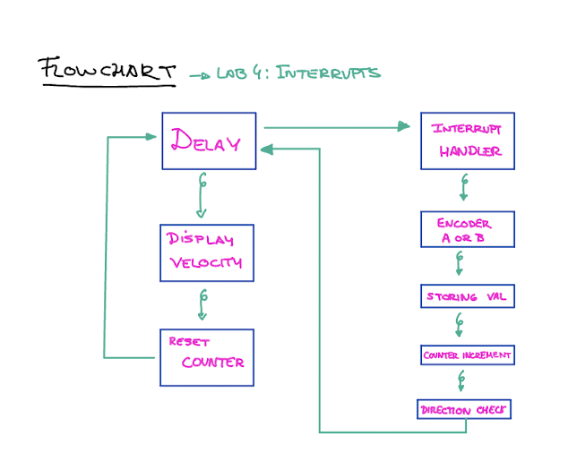 The main loop is executing on the left and the interrupt handler that is triggered whenever an encoder channel pulses is on the right.
