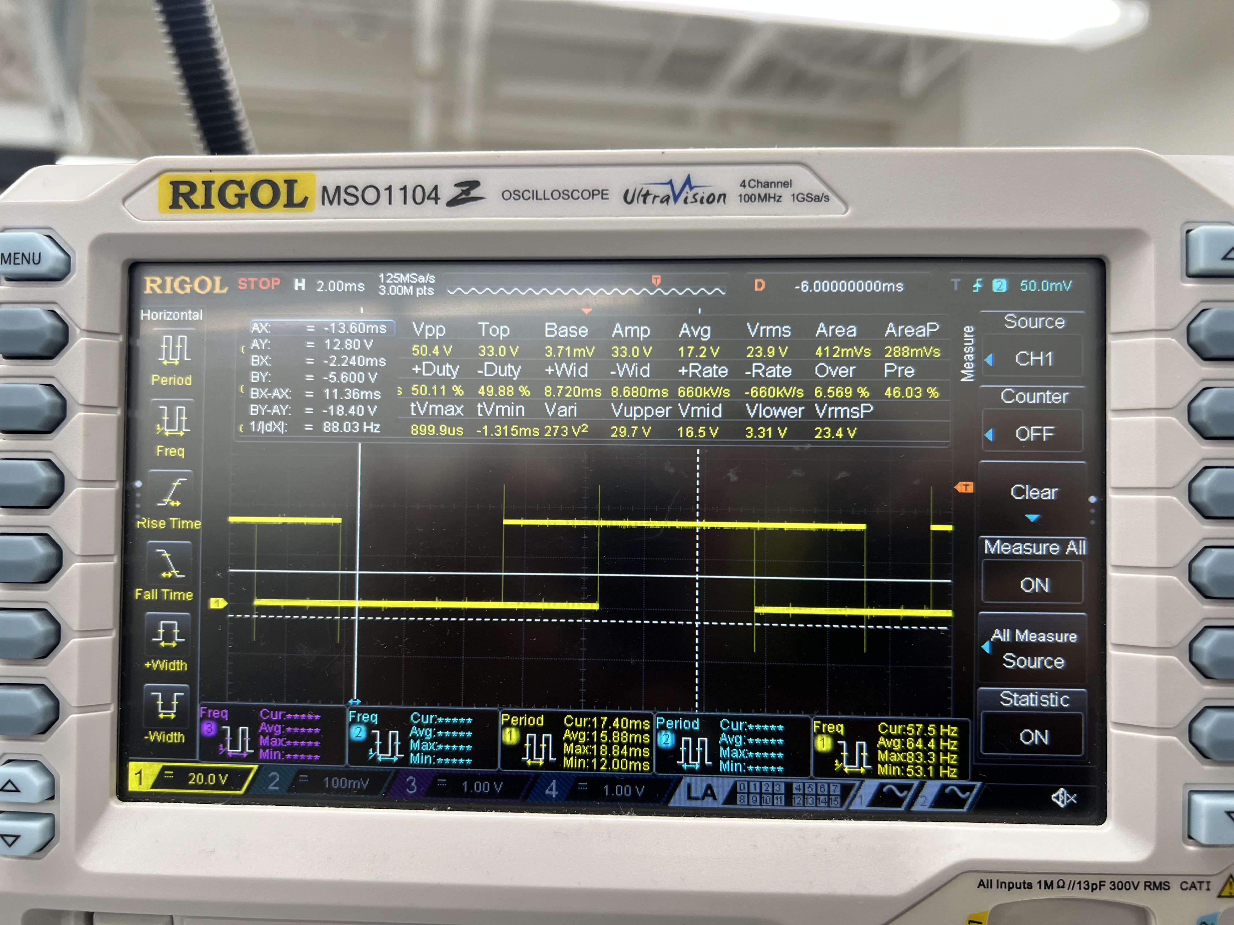 To test my motor, I connected it to a power supply and adjusted the voltage while it was attached to my circuit. I initially ran the motor at very low speeds in both directions to visually verify that the reported rotation direction matched the actual movement, which it did. I also connected the encoder channels to an oscilloscope and saw how the interaction with the interrupt handler was occurring.