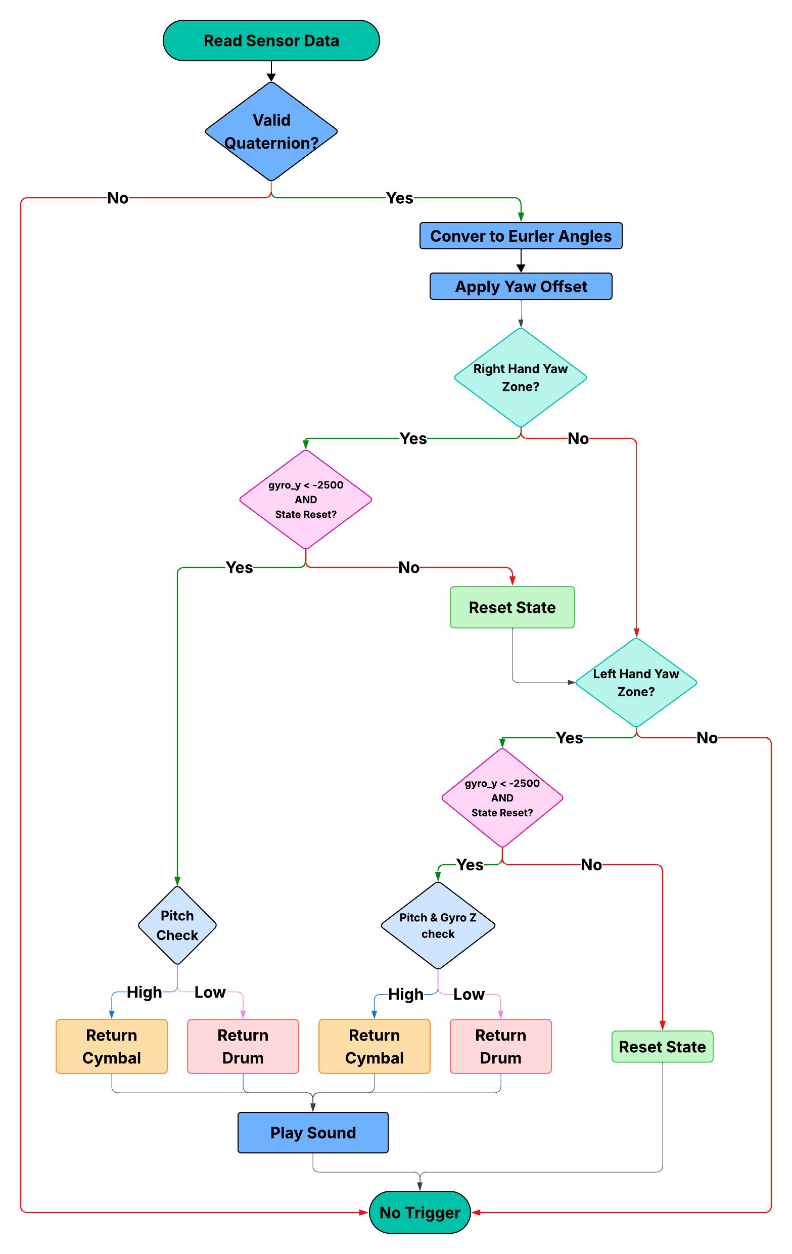- drum_detector.c Core drum trigger detection using yaw zones, pitch thresholds, and gyroscope readings. Checks both sensors against predefined zones and returns drum codes (0x00-0x07) when strike conditions met.